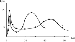Рис.3.18 ХЛ крива окиснення охмеленого сусла Т=700С,W(Na2S2O8) =7%: 1 – сусло без добавок, 2 – сусло з додаванням 0,25 мл. водно-етанольного екстракту деревини дуба та аскорбінової к-ти (25 мг./л),