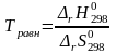 Если пренебречь изменением ΔS0 и ΔН0 с увеличением температуры, то можно определить Травн, т.е. температуру, при которой устанавливается химическое равновесие химической реакции для стандартного состояния реагентов, т.е. из условия равновесия реакции ΔG=0 имеем 0=ΔrH 0298– TΔrS 0298, отсюда