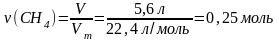 Из уравнения реакции видно, что на сгорание СН4 количеством вещества 1моль расходуется О2 количеством вещества 2 моль, на сгорание СН4 количеством вещества 0,25 моль расходуется х моль О2, откуда х = 0,5 моль.
