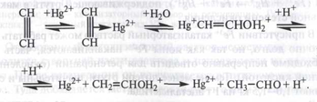 Реакция сильно экзотермична. До 300 °С она практически необратима, но с дальнейшим ростом температуры равновесие смещается в сторону разложения ацетальдегида. Она протекает в нужном направлении с приемлемой скоростью в присутствии катализаторного раствора (10-20%-ная H2SO4, содержащая 0,5-0,6% HgO в виде HgSO4). Реакция протекает через промежуточное образование комплекса ацетилена с Hg2+. Дальнейшее его разложение приводит к образованию ацетальдегида[3, с.440]: