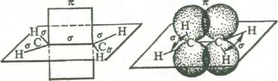 При образовании двойных связей в молекулах ненасыщенных соединений встречают с гибридизацию одной s- и двух р-орбиталей углерода с образованием трех эквивалентных гибридных орбиталей, называемую sp2-орбиталями. Каждая из них имеет цилиндрическую симметрию относительно одной из трех осей, расположенных в плоскости под углом 120°, В реальной молекуле этилена угол Н-С-Н равен 116,7°[16, с.30].