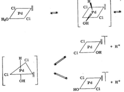 Образование ацетальдегида при взаимодействии этилена с водным раствором хлористого палладия наблюдал Филлипс ещё в 1894 г. Образующийся в безводной среде комплекс этилена с хлористым палладием был описан Карашем в 1938 г. При взаимодействии палладиевого комплекса с водой происходит окисление активированного олефина с образованием ацетальдегида, выделением палладия и хлорида водорода. [6, с.302]