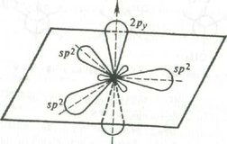 Ось четвертой атомной р-орбитали, не затронутой гибридизацией, расположена под прямым углом к плоскости, в которой лежат три оси sp2-гибридных орбиталей.