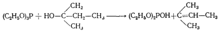 Большое влияние на характер переэтерификации оказывает строение исходного спирта. В то время как алкоголиз триалкилфосфитов первичными и вторичными спиртами протекает нормально, при взаимодействии триэтилфосфита с трет-амиловым спиртом были выделены диэтилфосфит и амилен: