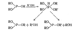Первый акт реакции является необходимым, но недостаточным для осуществления переэтерификации фосфита (фосфинита). Образовавшийся аддукт, как показано выше, может расщепляться по двум направлениям. При алкоголизе любого фосфита любым спиртом устанавливается равновесие: