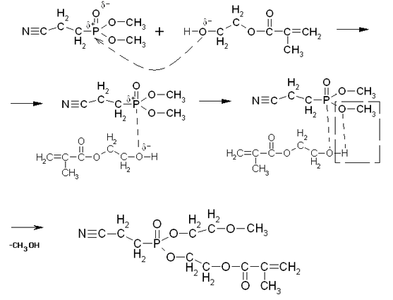 Механизм реакции переэтерификации эфиров кислот трехвалентного фосфора подробно не изучен. Предполагается, что механизм этой реакции состоит в чередующихся процессах присоединения протона к атому фосфора, алкоксил-аниона — к фосфоний-катиону и отщепления спирта от промежуточного продукта с пятивалентным фосфором с образованием исходного или другого фосфита или фосфинита: