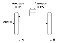 Метод азеотропной ректификации применим как для смесей с малым коэффициентом относительной летучести, так и для азеотропообразующих смесей (в том числе при составах, близких к азеотропу). При азеотропной ректификации разделяющий агент образует с каким-либо компонентом разделяемой смеси азеотроп с иным соотношением компонентов, нежели в исходной смеси, если последняя является азеотропообразующей. В качестве разделяющих агентов могут применяться вещества, образующие гомоазеотропы с компонентами исходной смеси (это могут быть азеотропы с максимумом или минимумом температур кипения), либо гетероазеотропы, представляющие собой тройные смеси разделяемых компонентов А и В с разделяющим агентом РА. Во всех случаях один из компонентов разделяемой смеси в колонне азеотропной ректификации может быть получен в практически чистом виде [10].