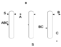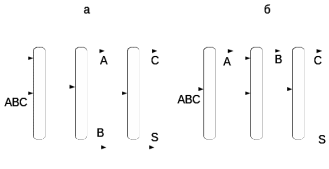 Рис.3. Разделение смеси АВС методом экстрактивной ректификации (а),(в) – с применением ЭА в первой колонне, (б) – с фракционированием исходной смеси