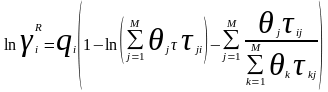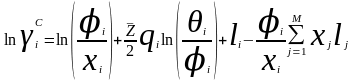 Избыточная энергия Гиббса (и соответственно логарифм коэффициента активности) делится на комбинаторную и остаточную части. Комбинаторная часть зависит только от размеров и форм отдельных молекул, она не содержит бинарных параметров. Остаточная часть, которая учитывает энергетические взаимодействия, имеет два регулируемых бинарных параметра. Выражение для коэффициента активности имеет следующий вид: