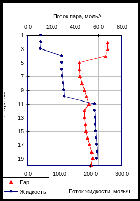 Далее на рис14. представлены профили температуры и скоростей жидкости и пара по высоте колонны при оптимальных технологических параметрах.