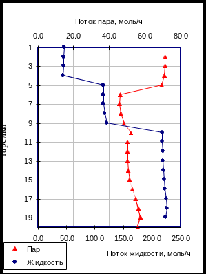 На представленных зависимостях отчетливо видны скачки изменения температуры и расходов пара и жидкости, соответствующие разноуровневой подаче ЭА и питания в экстрактивной колонне.