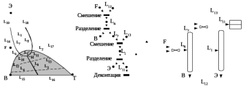 Согласно данному алгоритму все составы концентрационного симплекса разбиваются на группы, объединенные термодинамическими связями и ограничениями (границами областей дистилляции и границей области расслаивания жидких фаз). Далее на основе выделенных групп определяются необходимые аппараты. Такой подход автоматически отбрасывает те аппараты, работа которых может привести к нежелательным продуктовым составам.