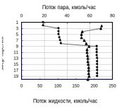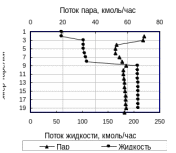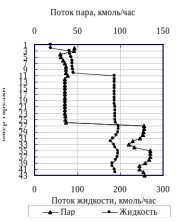 На рис.34 представлены профили температур и расходов жидкости и пара по высоте ректификационной колонны, содержащей две боковые секции (схема 1-3) Ф для состава ЦГ – Б – ЭБ = 10 – 80 – 10% мол.