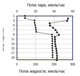 Рис.34. Профили температуры и потоков жидкости и пара сложной колонны, содержащей два боковых отбора. Состав исходного питания ЦГ – Б – ЭБ = 10 – 80 – 10% мол.
