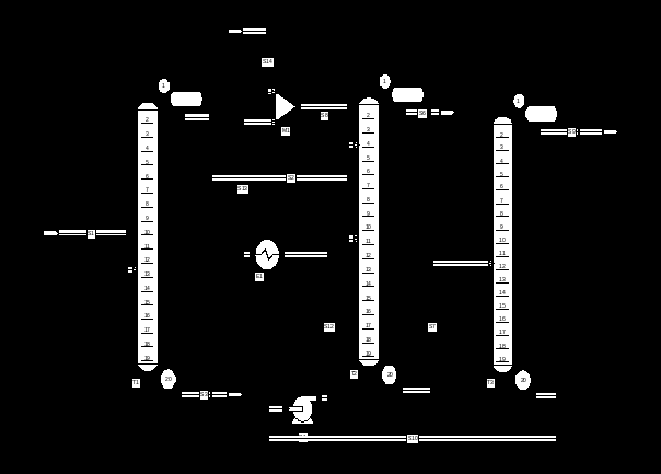 Таким образом, нами была рассмотрена экстрактивная ректификация азеотропной смеси циклогексан – бензол – этилбензол с использованием анилина в качестве разделяющего агента. Для осуществления разделения синтезированы схемы, принадлежащие разным классам, одни из них – это схемы, состоящие из двухотборных колонн, другие – схемы, содержащие сложные колонны с боковыми секциями. Последние относятся к структурам с частично связанными тепловыми и материальными потоками, позволяющие снизить энергопотребление за счет приближения к термодинамической обратимости. Связывание секций колонн потоками определенным образом позволяет отказаться от наличия кипятильников или дефлегматоров для боковых секций, которые являются источниками термодинамической необратимости. В целом организация разделения в колоннах со связанными потоками приводит к снижению энергозатрат. В ходе работы нами была показана эффективность использования таких структур по сравнению с традиционными двухотборными экстрактивными комплексами.