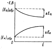 При постоянной величине сопротивления электролита причина настоящего неравенства обусловлена изменением величины числителя. При этом потенциал анода, как показано на рисунке 1.3, становится положительнее, а потенциал катода – отрицательнее: