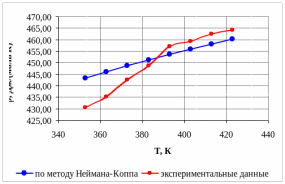 Как видно из графиков (рисунок 2.1) , рассчитанная по методу Неймана-Коппа теплоемкость несколько различается, однако максимальная разница между значениями не превышает допустимых 8 % [18] (для температуры 353 К, где разница максимальна, она составляет 3,1 % по отношению к меньшему значению теплоемкости).