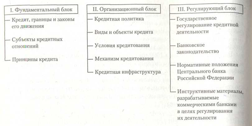 Отдельно в составе кредитной системы следует выделить третий, блок регулирующий, к которому относится государственное регулирование кредитной деятельности, а также банковское законодательство. Оно призвано регламентировать кредитные сделки, защищать права кредитора и заемщика, определяет правила погашения кредита в случае несостоятельности кредитных организаций. Большую роль в этом процессе играют нормативные положения Центрального банка Российской Федерации. Коммерческие банки, кроме того, разрабатывают свои инструктивные материалы, регламентирующие правила кредитования.