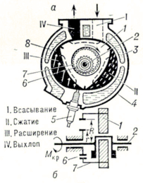Газообмен регулируется вершиной ротора при прохождении ее через впускное и выпускное окно. Такая конструкция позволяет осуществлять 4-тактный цикл без применения специального механизма газораспределения.