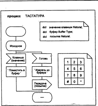 Пример процесса «Тастатура» приведен на рис. 2.2. Пустой символ в верхнем левом углу означает начало процесса. Он ведет к исходному состоянию, в котором процесс может принять два входных сигнала: «Клавиша» или «Готово». Все переменные являются локальными для процесса. Символы ниже входных сигналов являются символами задачи для внутренних действий процесса. Задача может быть формальной или содержать неформальный текст в одинарных кавычках, как это имеет место на рис 2.2. Под правым символом задачи находится символ выхода: