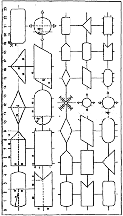 Первые выпуски Рекомендации Z. 100, издаваемые МККТТ, включали специальную линейку-трафарет (шаблон) для рисования SDL-диаграмм с использованием графического синтаксиса SDL. Этот шаблон изображен на рис. 2.3.