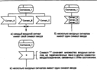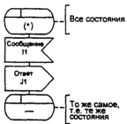 Тире (•) используется в символе следующего состояния для того, чтобы представить то же самое состояние, что и состояние, с которого начался переход. Интерпретация этого рисунка может быть такой: в любом состоянии процесса сигнал «Сообщение» может быть принят. При-