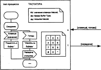 Определение процесса можно повторно использовать, определяя его как тип, путем добавления ключевого слова тип и двух интерфейсов (шлюзов), которые описывают принимаемые и передаваемые сигналы. Это иллюстрирует рис. 2.15, являющийся развитием рис. 2.2, приведенного в начале этого параграфа.