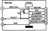 В данном MSC-описании определены процесс OTLOC обработки сигналов; сообщения NEW_CALL (новый вызов), SEIZURE (занятие), АСК (подтверждение занятия), B_NUMBER (номер абонента Б), CONGESTION (занятость промпутей), REJECT (отказ), DISCONNECT (разъединение), RELEASE_GUARD (контроль исходного состояния), IDLE (исходное); вентили 1, 6,9 к программному обеспечению обработки вызовов и все остальные к физическому уровню интерфейса с соединительной линией; тайм-ауты Т1 (ожидание поступления подтверждения занятия) и Т2 (время непроизводительного занятия соединительной линии).