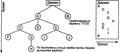 В TTCN такое дерево взаимодействий называется деревом поведения. Структура дерева представляется посредством увеличивающихся уровней отступов для показа продвижения по дереву относительно времени (рис. 2.22).