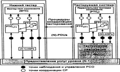 Система должна содержать, по крайней мере, одну из тестирующих компонент. Эта компонента будет являться мастер-компонентой (МТС -Master Test Component), ответственной за координацию и управление ходом теста и за вынесение окончательного вердикта. Связь между тестирующими компонентами каждого из тестеров осуществляется через точки координации (СР - Coordination Points). Координация между верхним и нижним тестером осуществляется посредством процедур координации тестирования (TCP - Test Coordination Procedures).