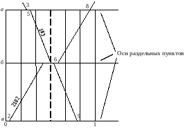 Нечетные поезда наносятся сверху вниз, а четные – снизу вверх. В точках пересечения линий движения поездов с осями раздельных пунктов в тупых углах ставится последняя цифра времени прибытия, отправления или проследования поездов, указывающая число минут сверх целого десятка.