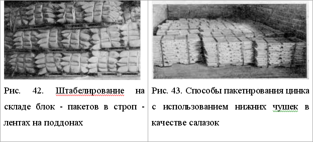 Пакеты в строплентах хранят на складе, их перегружают складскими машинами на поддонах 1200Х1600 и 1200Х1800 мм (рис. 42). Предпочтительны гребенчатые поддоны, так как загрузку вагонов и подпалубного пространства судов ведут погрузчиками с многовилочными захватами и сталкивателями. Если используют плоские поддоны, то в процессе передаточной операции погрузчик с вилами поднимает пакеты за петли, снимает с поддона и устанавливает на гребенчатый станок или непосредственно на многовилочный захват другого погрузчика. Штабелирование пакетов в строплентах непосредственно погрузчиком с вилами при подъеме за петли не рационально, так как скорости движения при этом снижаются (из-за раскачивания пакета) и, кроме того, верхние ярусы штабеля под потолком загрузить не удается.