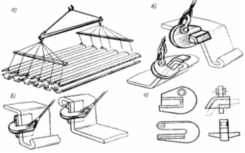 |   Рис. 46. Грузозахватные устройства для шпунта: а — подвеска с захватами для подъема шести балок; б — угловой захват для застропки за боковые стенки; в — боковой захват; г — конструкция скоб  |