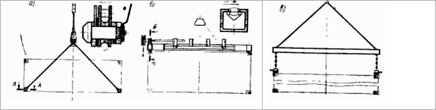 б) использования простых универсальных захватов (в основном стропов) и разных подкладок из подручных материалов (сепарационных досок, металлических уголков и резиновых накладок) (рис. 51, б).