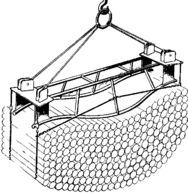 Из полувагонов пакеты выгружают по ярусно краном со специальной крюковой подвеской — по одному пакету в подъеме. Застропку осуществляют за проушины пакетообразующих средств. Круглый лес россыпью выгружают краном с лесным грейфером (рис. 66), но верхний слой груза («шапку») снимают с помощью стропов. Застропку производят «в удав» роликовыми скобами. Стропы заводят под «шапку» с помощью проволочных крючьев.