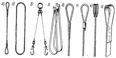 а — концевой одинарный строп; б — кольцевой строп; в — групповой концевой строп с крюками; з — два ленточных концевых стропа, д — огон стального стропа, изготовленный заплеткой с оклетневкой; е — огон стального стропа, изготовленный методом опрессовки втулкой из легких сплавов; ж — конец стального стропа с грушей; з — огон ленточного синтетического стропа, изготовленный сшивкой