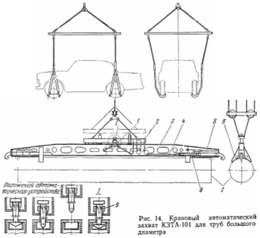 На рис 14 показано автоматически действующее более сложное по конструкции грузозахватное приспособление зацепного типа Захват КЗТА-101 закрывается и труба удерживается за счет сближения тележек с крюками приводными канатами 4 под действием веса балки 3 и груза при натяжении краном стропов подвески Захват раскрывается пружинами 5, под действием которых тележки с крюками раздвигаются при опускании груза на опору, а траверсы 2
