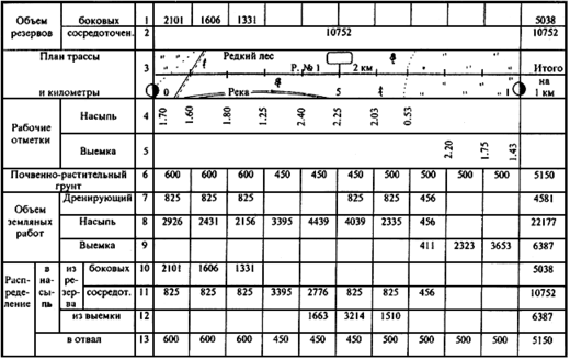 Объем оплачиваемых земляных работ находится как сумма объема насыпи и грунта, идущего в отвал (почвенно-растительный грунт, непригодный грунт выемок). По каждому километру и по всей трассе объемы суммируются и отражаются в графе "Итого".