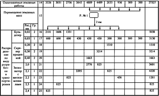 Распределение земляных масс показывается на специальном графике (табл.8) в два этапа. На первом этапе устанавливаются возможные источники получения грунта для насыпей и места его отсыпки (заполняются 1-я - 15-я строки графика), на втором - распределяются объемы грунта по видам разработки и транспортировки после технико-экономического выбора ведущего механизма. В табл.8 представлен пример графика для участка дороги ПК0 - ПК10.