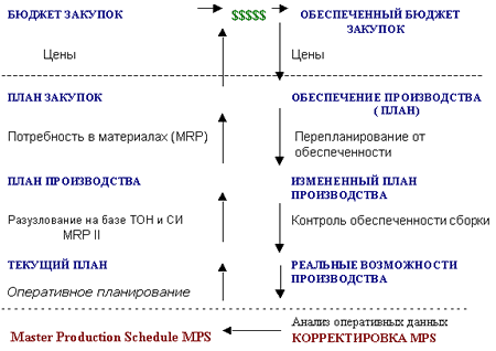 На практике разработка MPS представляется петлей планирования. Первоначально формируется черновой вариант для оценки возможности обеспечения реализации по материальным ресурсам и мощностям.