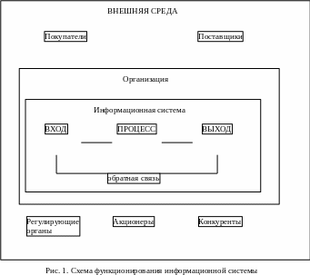 В информационной системе, также как и в организации необходимо учитывать внешнее окружение в целом, поскольку и та, и другая являются открытыми системами, зависящими от взаимообмена вводимыми ресурсами и результатами деятельности с внешним миром (см. рис.1).