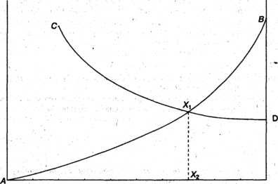 Соотношение кривой АВ (степень трудового напряжения) и кривой CD (предельная полезность каждого дополнительного рубля) определяет момент «хозяйственного равновесия трудового хозяйства». Точка равновесия X1 = 67 руб., на которой «естественно остановится продукция нашего хозяйствующего человека». X2 – сумма годового дохода хозяйства; Х1Х2 – степень субъективной оценки полезности предельного дохода, определяемого сложившимся типом потребностей крестьянской семьи.