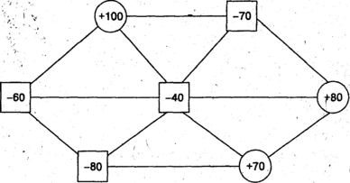 В данном случае имеются четыре потребителя (квадратики) и три поставщика (кружочки). Линии, соединяющие пункты, изображают маршруты поставок (транспортную сеть). Цифры внутри квадратиков показывают объемы спроса (со знаком минус), внутри кружочков – размеры предложения (со знаком плюс).