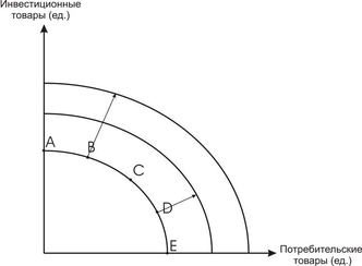 Все ресурсы расходуются на производство двух групп товаров: потребительских (товары для настоящего) и инвестиционных (товары для будущего).