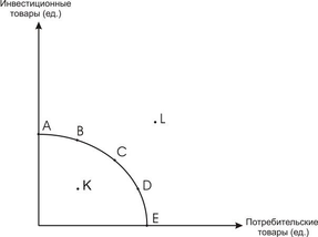 На графике это точки A - Е, точка K означает неполное, то есть неэффективное использование всех ресурсов, точка L – жизнь в долг или невозможность. Рассмотрим, к примеру, точку A – она означает, что все ресурсы используются на производство инвестиционных товаров, в точке Е все ресурсы расходуются на производство потребительских товаров, точки B – D означают производство разных комбинаций двух товаров. Точка K имеет место, например, когда в данной стране есть безработица. В этом случае ресурс труд не используется эффективно.