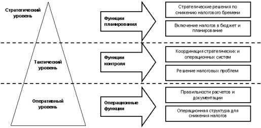 Налоговое планирование призвано выполнять оперативные функции, функции контроля и собственно функции планирования. Таким образом, налоговое планирование можно изобразить в виде трехуровневой системы, включающей оперативный, тактический и стратегический элементы (рис.), в зависимости от которых трансформируется объективная сторона процесса налогового планирования, видоизменяются мероприятия по планированию налогов.