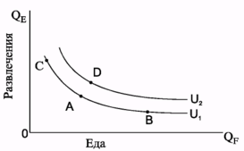 Графическое изображение различных комбинаций двух экономических благ, имеющих одинаковую полезность для потребителя, называется кривой безразличия (U). Множество кривых безразличия одного потребителя образуют карту безразличия. При этом чем правее и выше расположена кривая безразличия, тем большее удовлетворение приносят представленные ею комбинации двух благ.
