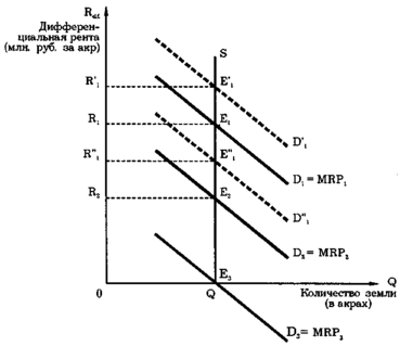Собственники лучшей земли за каждый акр будут получать ежемесячную дифференциальную ренту R1 а собственники средней земли – ренту R2. Дифференциальная рента с худшей земли будет равна нулю. Однако плодородие земли может быть улучшено искусственно. Дополнительная отдача от вложений капитала может повысить производительность труда, понизить или оставить ее на том же уровне. В случае, если добавочные вложения капитала приведут к росту эффективности производства, то возрастет и рента. Для лучших земель она поднимется до R'1. В случае, если добавочные вложения капитала приведут к общему падению эффективности производства, говорят о снижающейся дополнительной отдаче. Рента с лучших земель соответственно снизится до R''1. В случае, если добавочные вложения капитала не изменят уровень эффективности, дополнительная отдача будет постоянной. Рента с лучших земель останется на том же уровне R1.