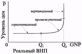 | Кейнсианский | Кейнсианство доказывает, что кривая AS горизонтальна. Это соответствует экономике в период спада и недоиспользования факторов производства. В такой ситуации повышение реального объема производства желательно, т. к. оно не сопровождается повышением уровня цен. |