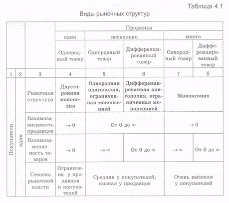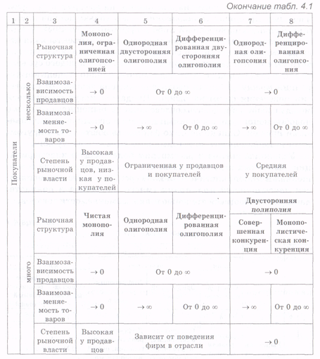 Усложним анализ и рассмотрим более общую классификацию рыночных структур (табл.4.1). Выделенные выше совершенная и монополистическая конкуренции - это разновидности двусторонней полиполии (много продавцов и покупателей), различающиеся степенью взаимозаменяемости товаров.